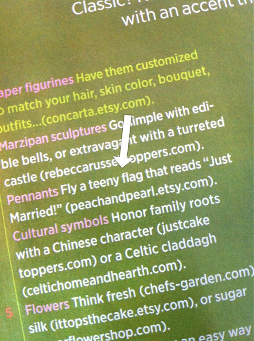 Yep, you read that right! I almost can’t believe it myself — I mean, heck, I only have 13 sales on Etsy! But here I am, on the last page of the current issue of Brides Magazine (the September issue):