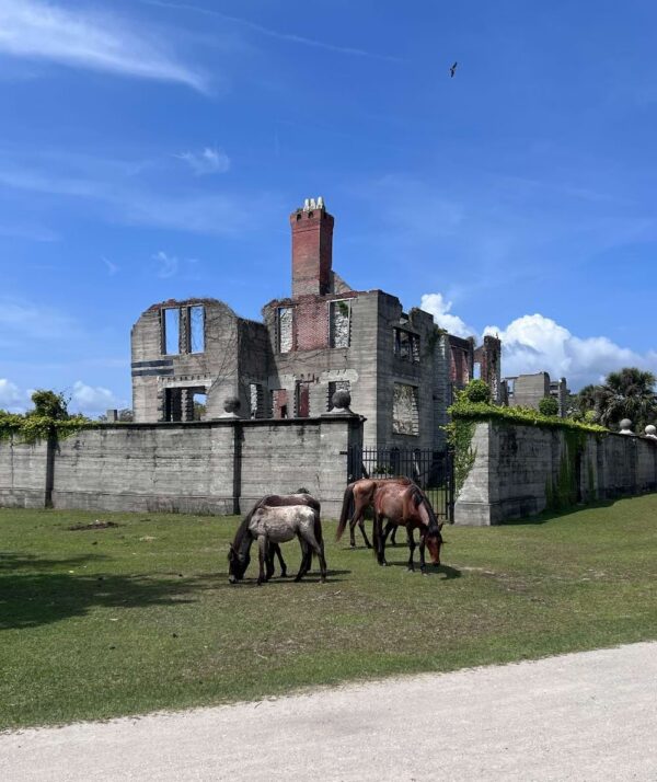 We took the 9:30am ferry over. It was another beautiful day, which made the 45-minute ride through the marshes a delight. Our four hours on the island were spent walking along the beach (we found three sand dollars and a giant blue whelk!), eating our packed picnic lunch beside the Dungeness ruins, and exploring the live oak forest luxuriously draped in Spanish moss. And all along the way, we saw wild horses — more than 20, including some babies.