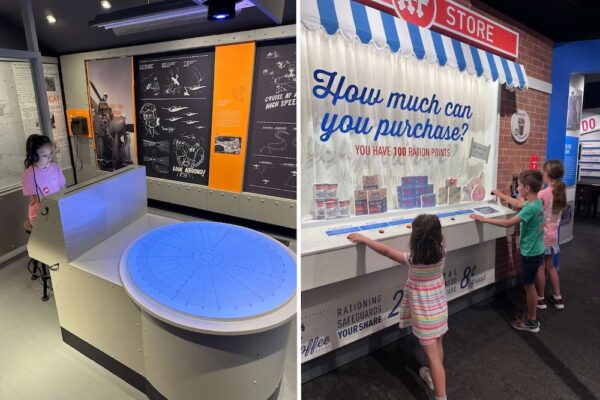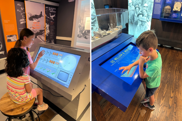 The kids truly enjoyed the Home Front Museum. You know how sometimes you go to a museum and the technology is pretty cruddy? This was not that. Everything was custom, responsive, clever, and so well done. We completed radar training, navigated airships, learned to tie knots, built Liberty ships, sent code, and more. We spent about two hours at the museum before biking over to lunch at Fiddler’s, which won top marks from all of us for vibes. Our food was great, too!