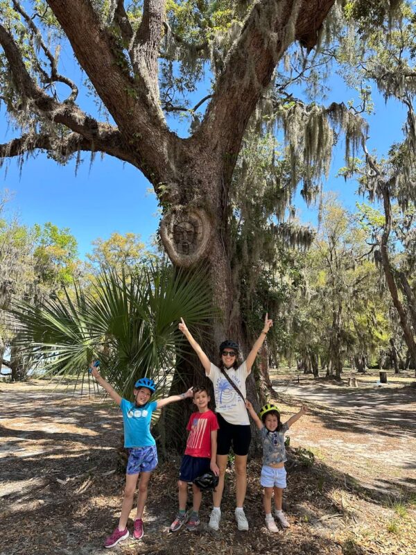 Our big adventure of the day was biking to the eleven public “Tree Spirits” around the island. Carved into live oak trees by a father-son duo, these fanciful pirates, mermaids, and faces were fun to spot as we criss-crossed the island on our bikes.